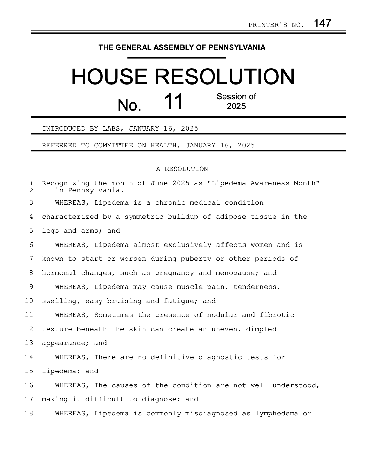 Exciting Progress for Lipedema Awareness! Pennsylvania's HR11 Bill Passes Health Committee! We're excited to share that HR11, which recognizes June as Lipedema Awareness Month, has successfully passed the Pennsylvania Health Committee! This marks a significant milestone in the ongoing efforts to raise awareness about lipedema, a chronic condition that disproportionately affects women.